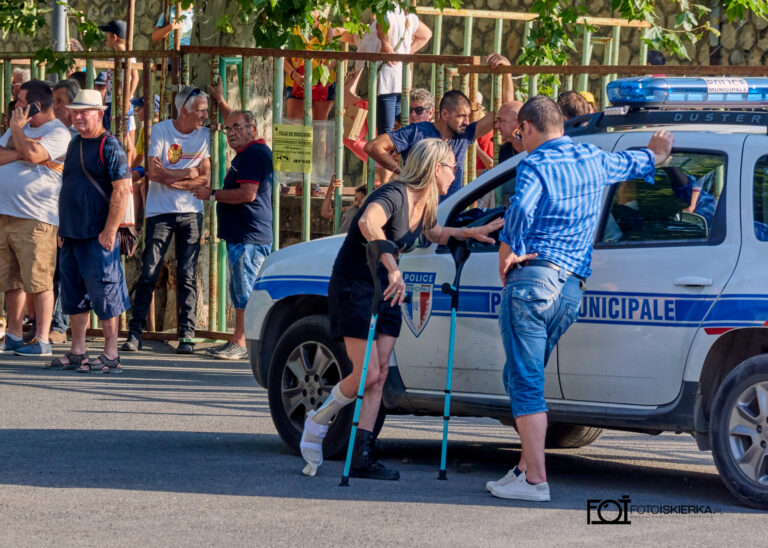 Policjant francuski uciekający przed bykami z Beaucaire w Prowansji we Francji